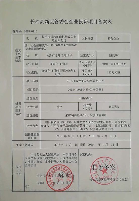 關于“長治市昌路礦山機械設備制造有限公司礦山機械設備及配套管材生產項目”環境影響報告表的批復